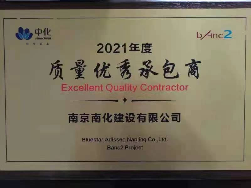 由十六分公司承建的蓝星安迪苏南京有限公司二期18万吨/年液体蛋氨酸项目机电工程2标段工程目前已实现中交,具备试生产条件,期间项目部质量团队严格执行国家法律法规、标准规范,认真贯彻落实公司的各项质量管理规定,积极配合业主、管理公司及监理质量管理团队的工作,及时解决和纠正施工中的质量问题。施工时采用首件样板制、焊接评优竞赛和质量员网格化等手段,实现了单位工程竣工验收合格率100%,合同履约率100%,焊接拍片一次合格率98.4%,重大及以上质量事故为零的质量目标。项目施工质量获得了业主、管理公司及监理单位的一致好评,授予“2021年度质量优秀承包商”荣誉称号。