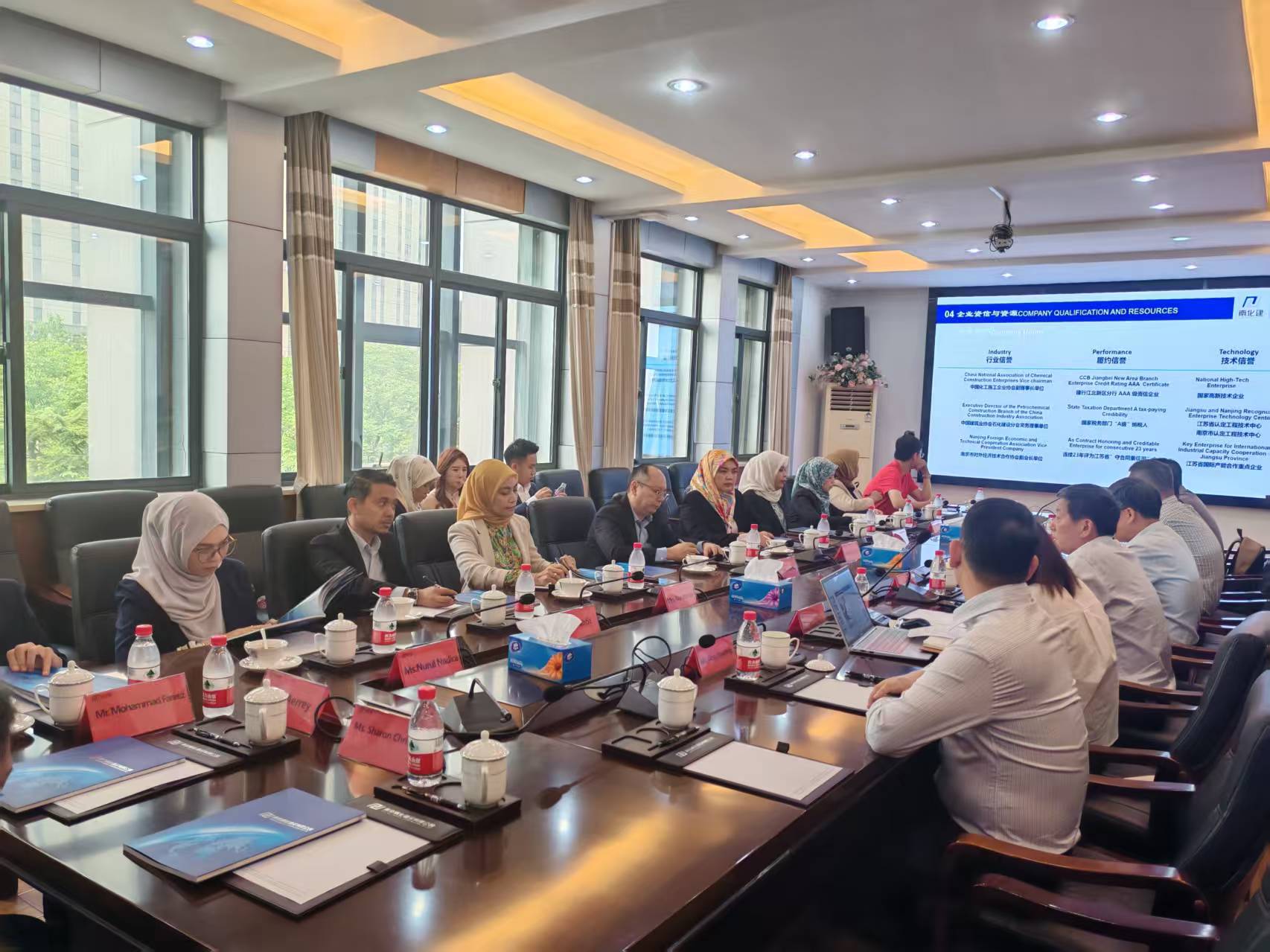 公司董事长武光携公司高管团队热情接待了代表团一行,并详细介绍了公司的建设资质、化工建设优秀成果以及公司管理体系。南化建设始终秉持“开放共享、互利共赢”的理念,期待与马来西亚在绿色能源、数字智能化工设施建设进一步开展合作,共同助力区域经济高质量发展。