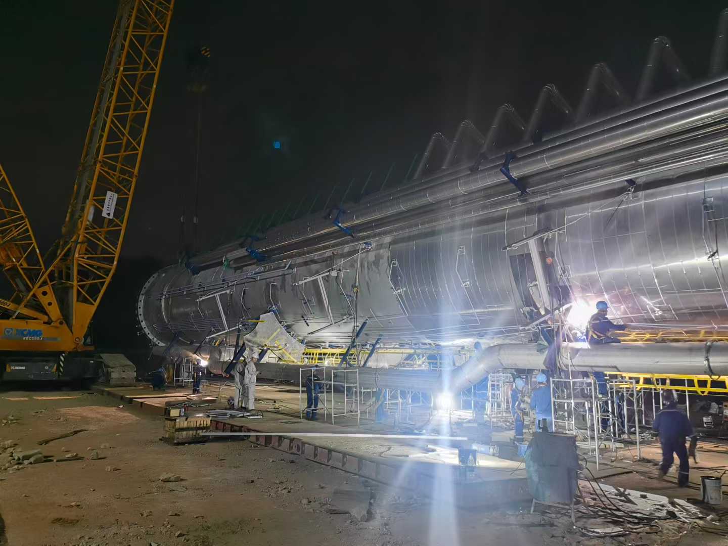 本次吊装的吸收塔设备自重400吨,加上附件等吊装重量重达480吨,直径5.2米,高度58.54米,是本项目最高,最重的设备。吊装使用1350吨履带吊,溜尾500吨履带吊,耗时一个月的时间穿衣带帽,于9月17日成功吊装,达到了塔起灯亮的效果。